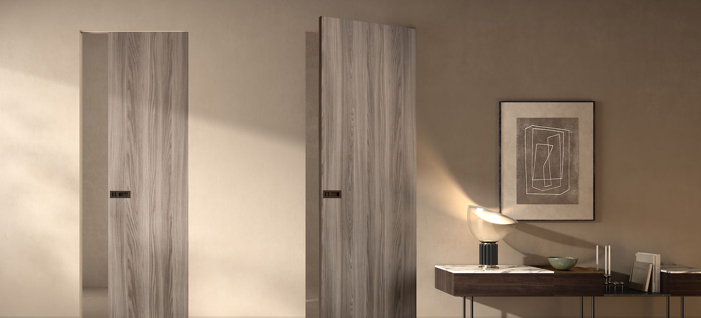 Disponibile per pareti in intonaco o cartongesso, questa soluzione consente di nascondere ingressi ad ambienti privati, come dispense o ripostigli, creando un effetto di totale continuità con le superfici circostanti.