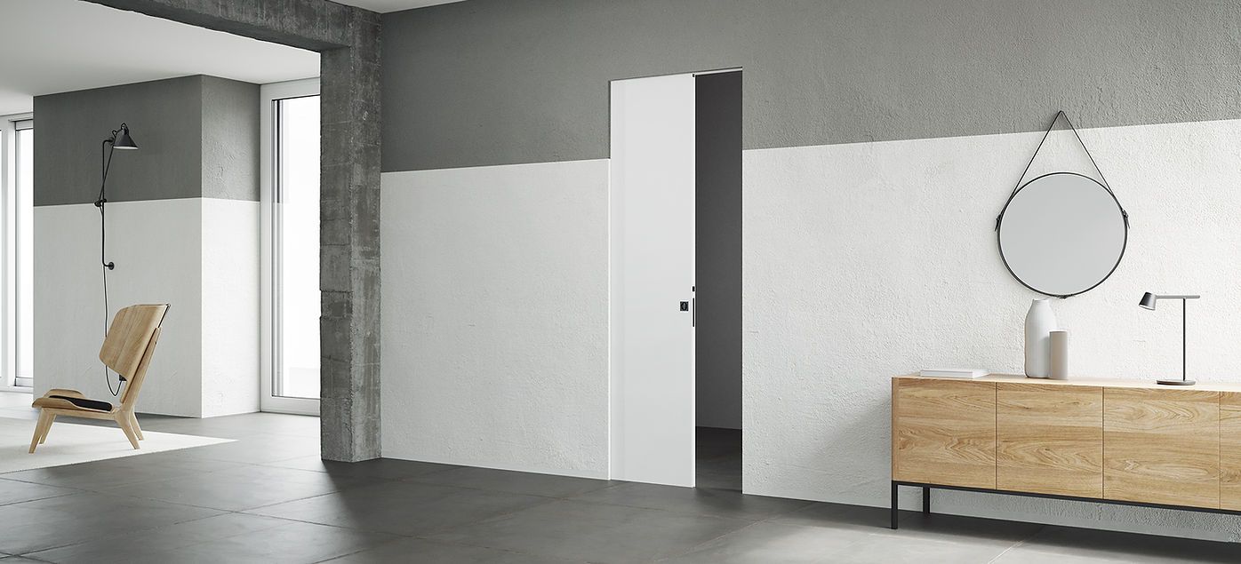 Il controtelaio di Ermetika abbinato al pannello Cataldoor consente a una o due ante scorrevoli di integrarsi perfettamente con la parete. I profili in alluminio, eliminando stipiti e coprifili, garantiscono una finitura impeccabile sia su pareti intonacate che in cartongesso.
